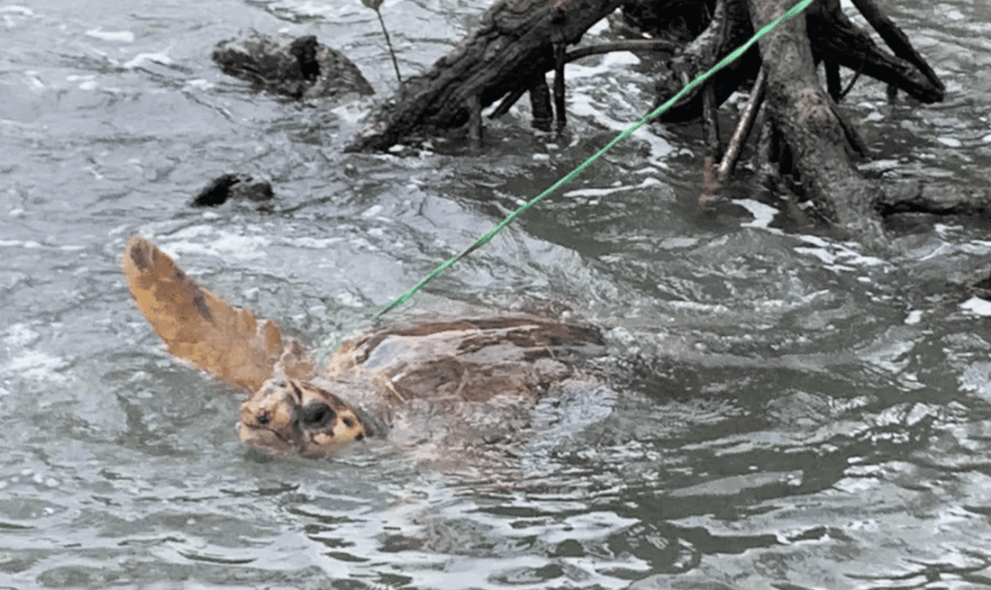 Caretta caretta salvata in Nuova Caledonia dopo essere stata legata alle mangrovie