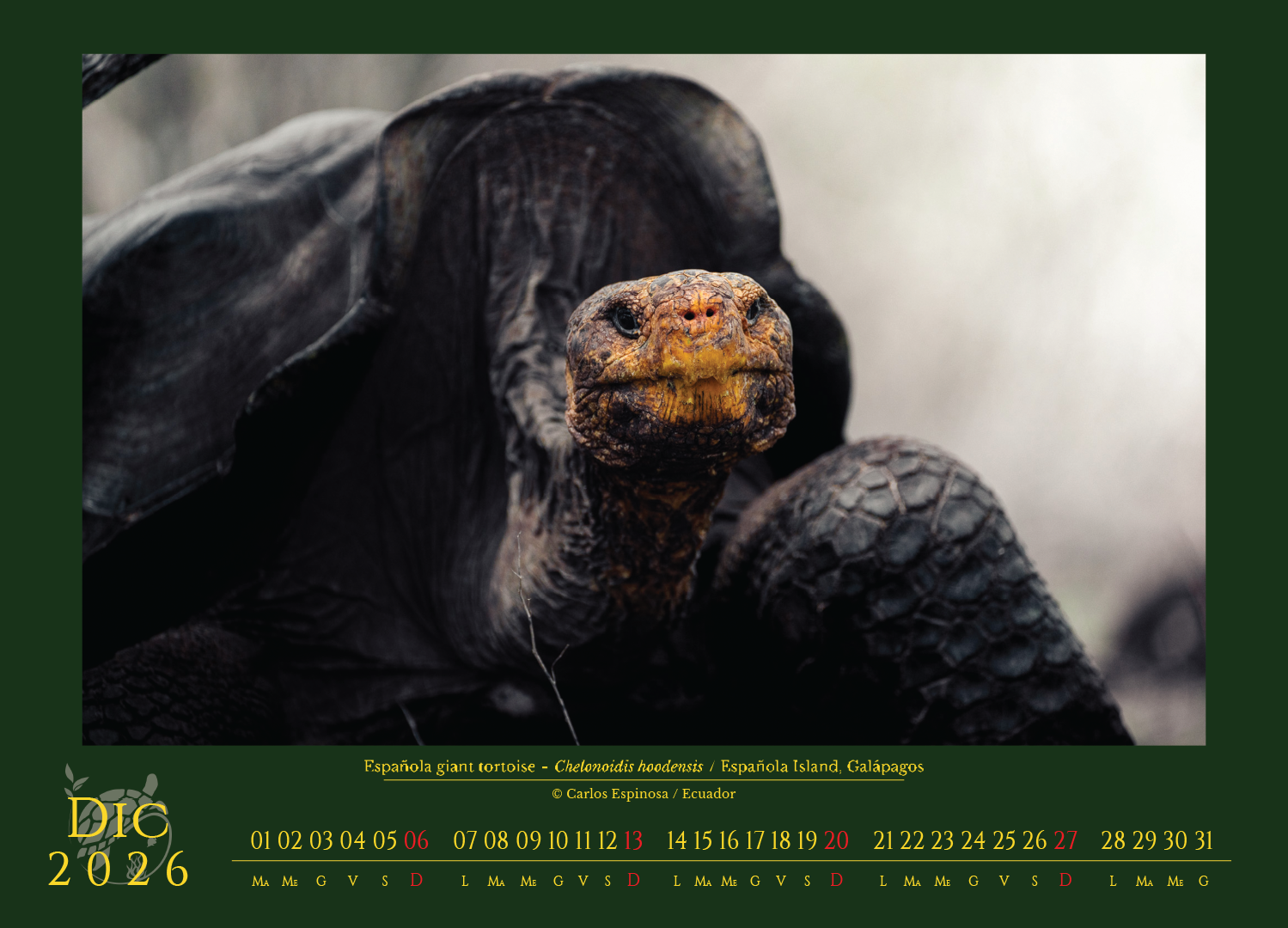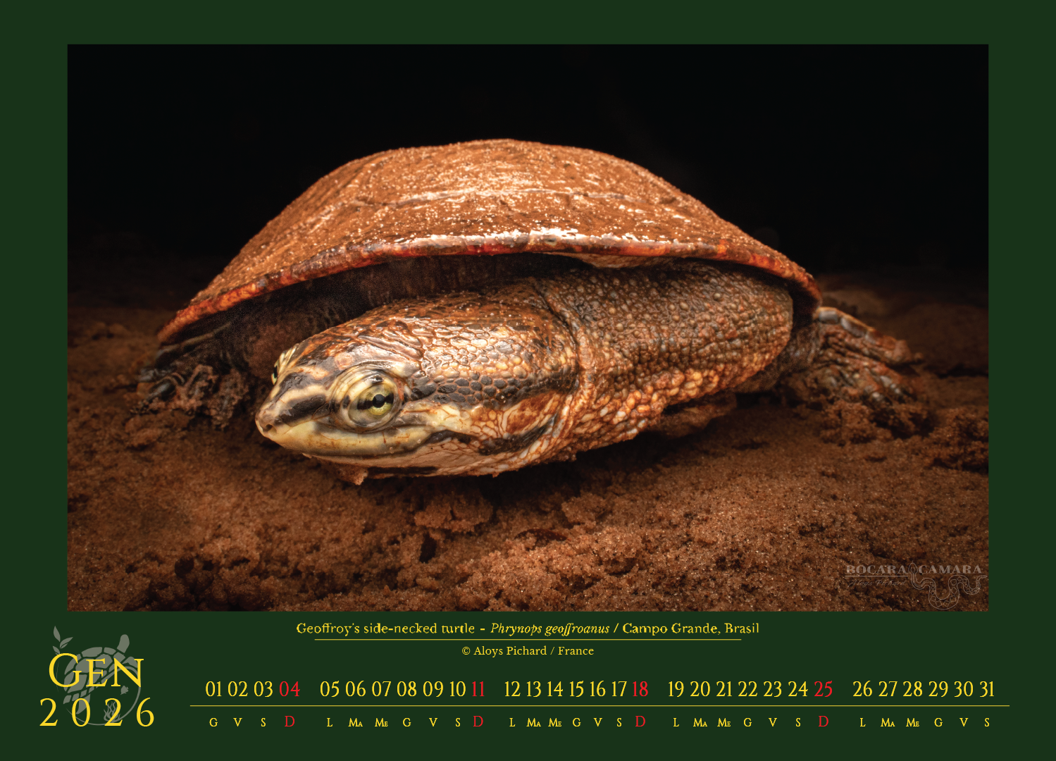 Grazie alla partecipazione di fotografi ed erpetologi internazionali, il Calendario 2026 offre una selezione unica di specie difficili da incontrare in natura, come la Chelonoidis hoodensis, la Mesoclemmys vanderhaegei o la Gopherus evgoodei, accanto a specie presenti in continenti lontani come la Emydura macquarii, senza dimenticare le specie più familiari come la Testudo hermanni e la Chelonia mydas.